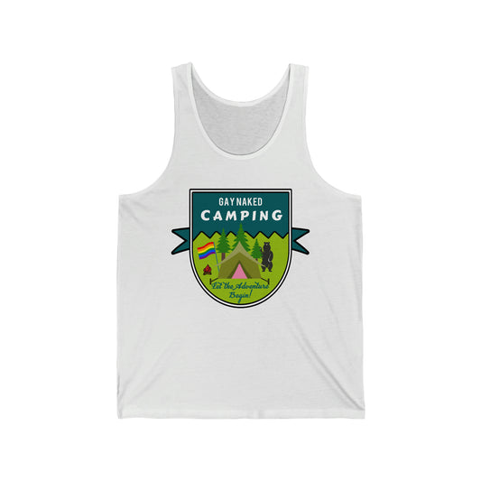 Camiseta sin mangas unisex para adultos con insignia de camping desnuda gay