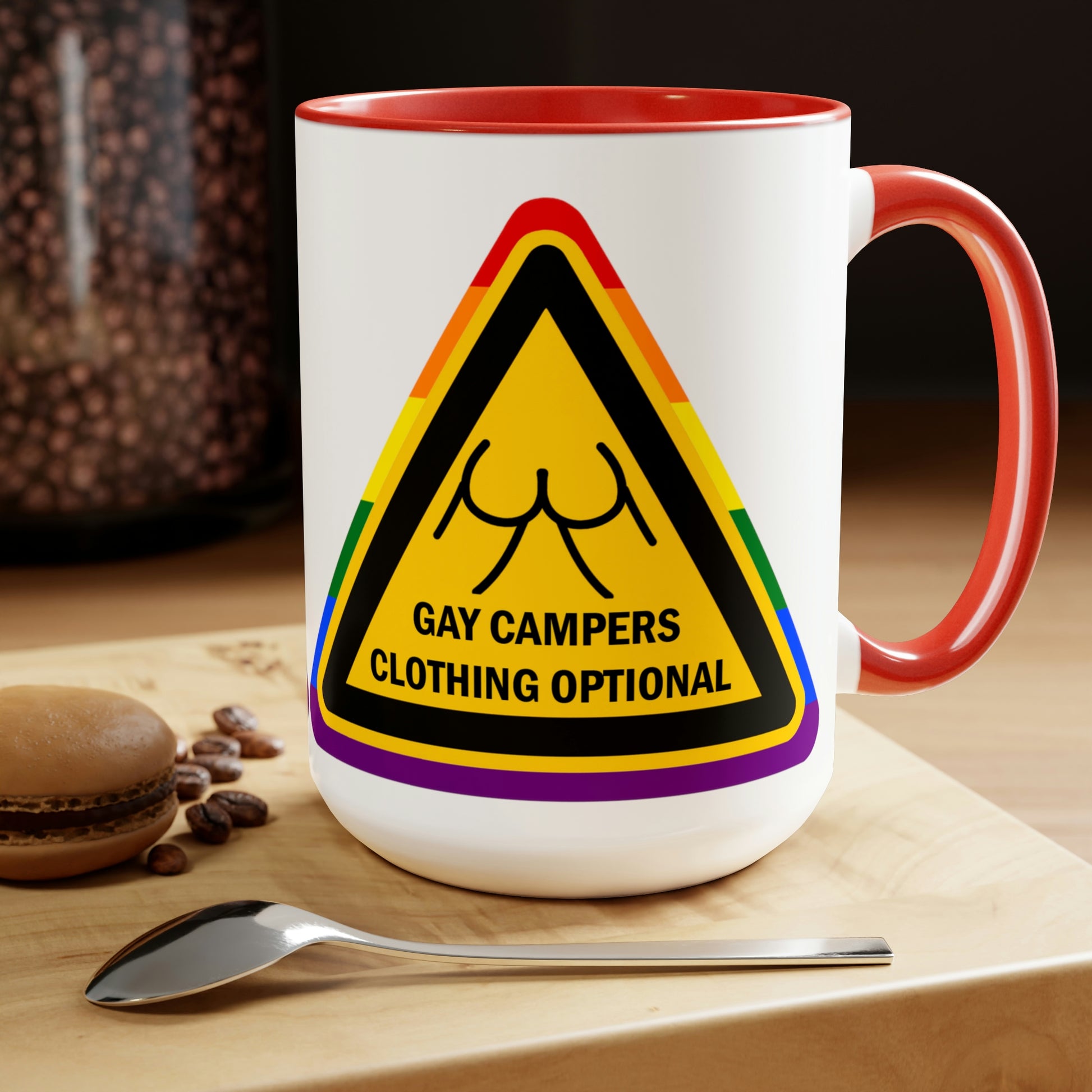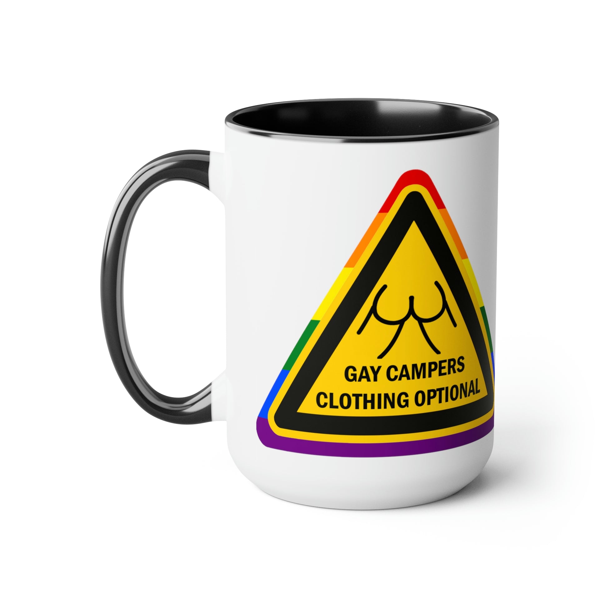 Campistas gay - Señal de advertencia opcional de ropa Tazas de café de dos tonos, 15 oz